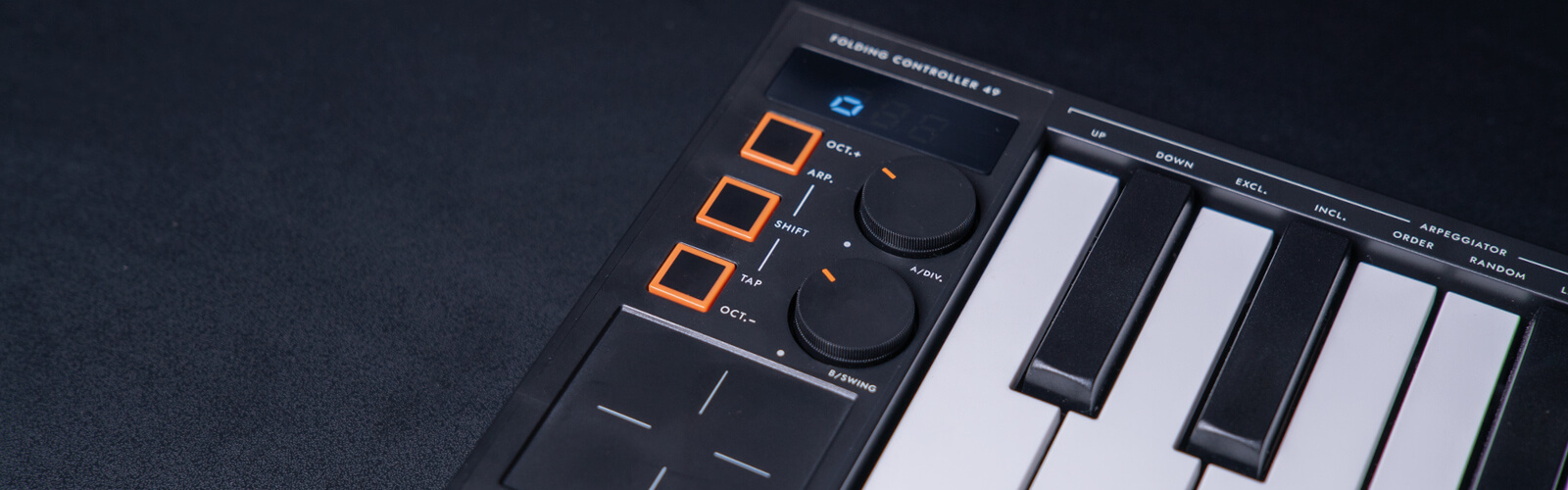 Folding Controller 49 is a fully featured, portable 49 key MIDI controller that offers full width keys, two customisable control knobs,, built-on arpeggiator and fits into a small bag or rucksack.