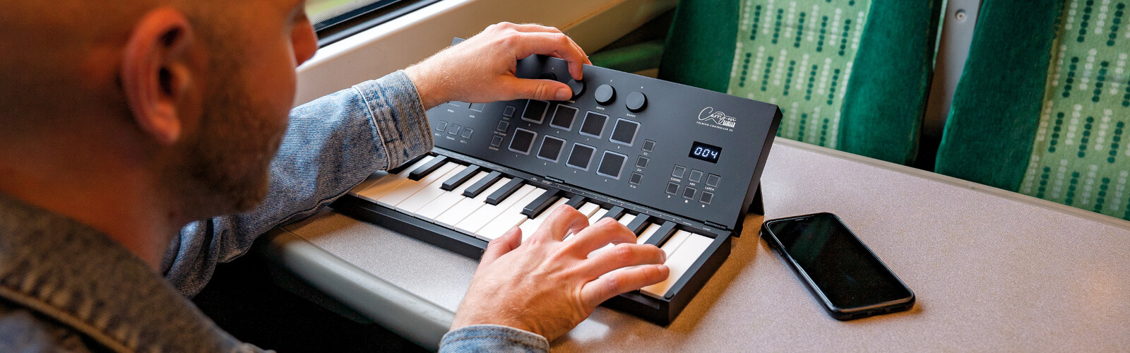 The Folding Controller 25 offers MIDI over Bluetooth®, USB-C, 3.5mm TRS, and analogue control voltage outputs. With a built-in Arpeggiator, four customizable knobs, velocity-sensitive keys and drum pads, plus pre-mapped transport controls, it’s your ultimate portable MIDI solution.